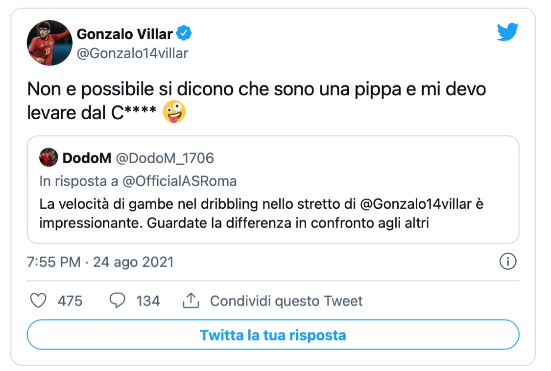 Gonzalo Villar contro i suoi stessi tifosi? Pare proprio di si a giudicare da un tweet che lo spagnolo ha postato rispondendo a un commento di un utente. Nello specifico il commento era positivo nei suoi confronti: "La velocità di gambe nel dribbling nello stretto di Villar è impressionante. Guardate la differenza in confronto agli altri", "Non e possibile, mi dicono che sono una pippa e mi devo levare dal c***o" la replica del calciatore della Roma che a quanto pare ha mal digerito alcune critiche ricevute. Dopo qualche minuto Villar ha rimosso il tweet.