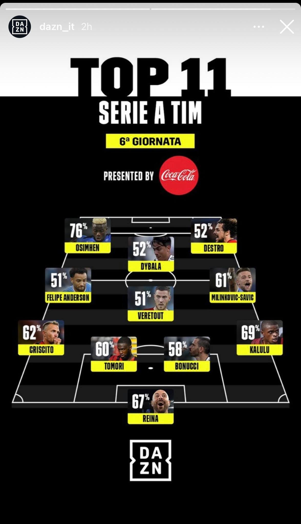 La sesta giornata del campionato di Serie A è stata archiviata e come sempre ecco arrivare la TOP 11 della settimana stilata da Dazn. Non poteva non esserci un biancoceleste, anzi tre, in formazione: da un lato Felipe Anderson autore di una gara praticamente perfetta e un gol realizzato, dall'altro Pepe Reina protagonista di parate bellissime oltre che decisive e infine Milinkovic-Savic anche lui superbo e a rete nella stracittadina. A completare la rosa Criscito, Tomori, Bonucci e Kalulu; Felipe Anderson, Veretout, Milinkovic-Savic; Osimhen, Dybala, Destro.