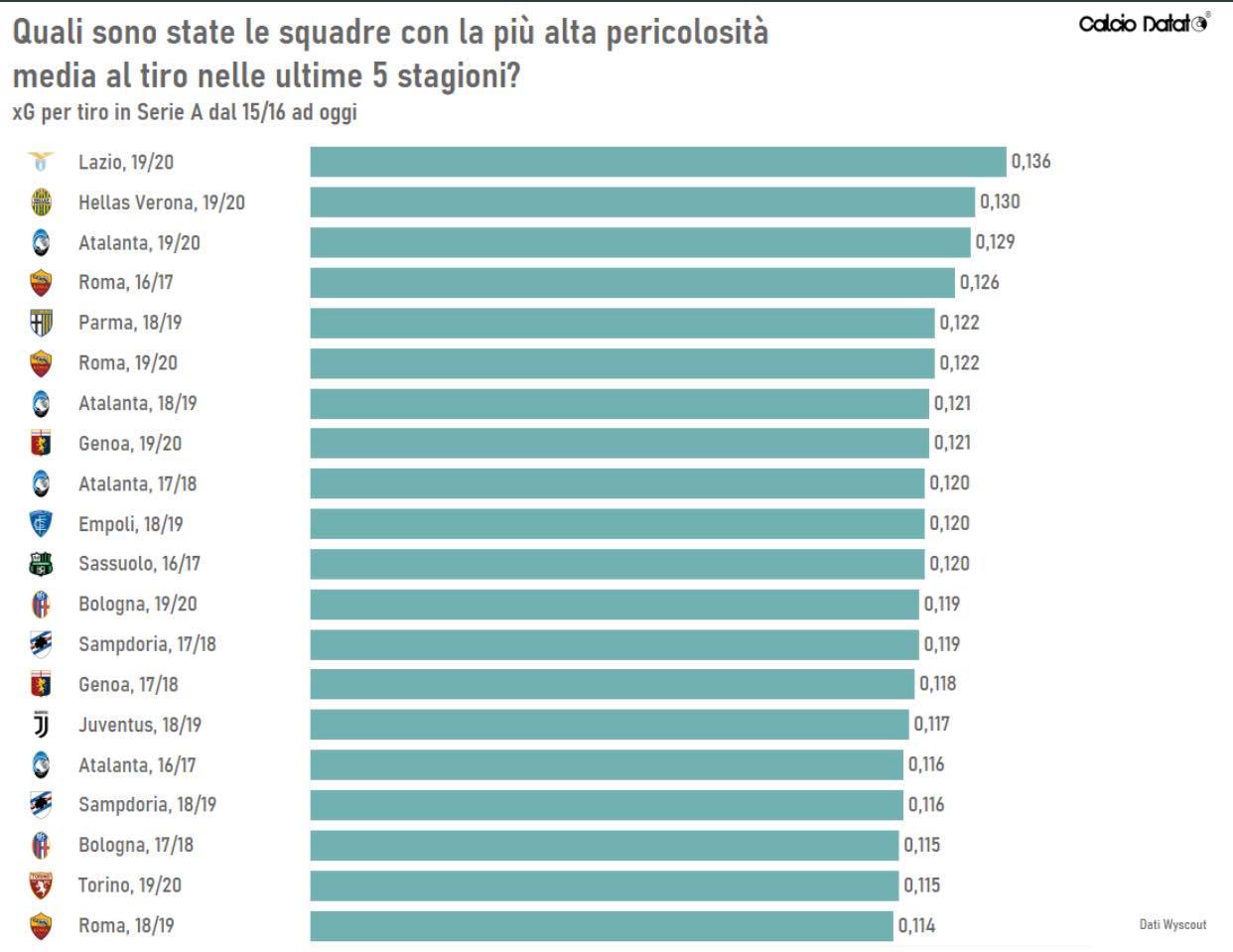 La Lazio si conferma compagine in grado di arrivare in porta con ogni mezzo. Inzaghi ha plasmato la sua squadra, l'ha resa temibile sotto ogni punto di vista. Non manca la qualità, che insieme al grande entusiasmo ha permesso ai biancocelesti di proclamarsi tra le rose più pericolose in Italia. Lo dimostra una speciale classifica riportata da Calcio Datato. Quest'ultima prende in considerazione la pericolosità media al tiro nelle ultime 5 stagioni. E proprio la Lazio si vede capolista, sopra all'Hellas Verona secondo e all'Atalanta. Un'altra dimostrazione del grande lavoro che questo gruppo fa da anni. Di seguito la classifica completa.