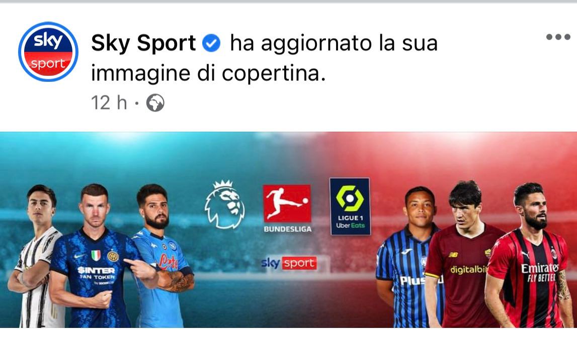 Mancano solo cinque giorni all'inizio della nuova stagione del campionato di Serie A che come noto da quest'anno non verrà trasmesso su Sky avendo Dazn, insieme a Tim, acquistato i diritti per il prossimo triennio. Sky avrà invece in esclusiva tutta la Bundesliga, la Premier League e la Ligue 1. La piattaforma tuttavia cambiando l'immagine di copertina dei suoi social ha inserito anche un richiamo al massimo campionato italiano dimenticandosi però della Lazio. Proprio così, nella foto si vedono chiaramente Dybala (Juventus), Dzeko (Inter), Insigne (Napoli), Muriel (Atalanta), Shomurodov (Roma) e Giroud (Milan). Nessun richiamo quindi ai biancocelesti e l'ennesima "svista" nei confronti della Lazio, che ovviamente non è piaciuta ai tifosi.