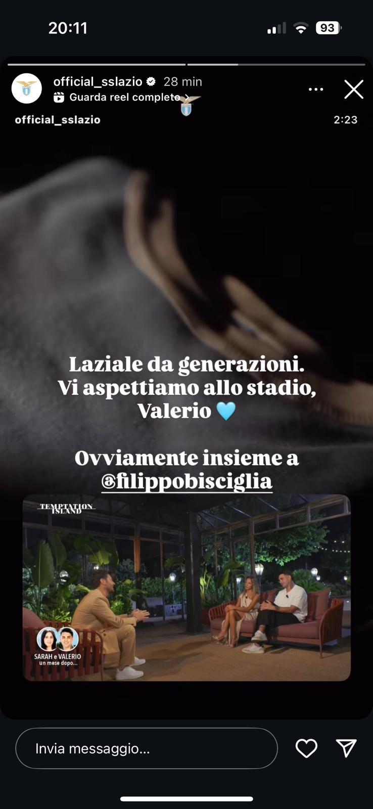 La Lazio è stata protagonista assoluta del viaggio nei sentimenti di Valerio e Sarah, tra i partecipanti dell'ultima edizione di Temptation Island. “Non rinuncio alla Lazio per nessuno” è la frase pronunciata dal romano nel villaggio, durante uno sfogo dopo aver visto alcuni video riguardanti la ragazza. I due sono usciti dal programma separati e il ventiseienne ha intrapreso la conoscenza con la single Arianna conosciuta nel programma. Anche lei tifosa biancoceleste. È stata proprio la passione per la Lazio a farli avvicinare e a far scattare la scintilla. E così, tramite il profilo social ufficiale, il club ha rivolto ai due giovani un invito. “Laziale da generazioni. Vi aspettiamo allo stadio, Valerio. Ovviamente insieme a Filippo Bisciglia” è il messaggio che si legge nella storia su Instagram.