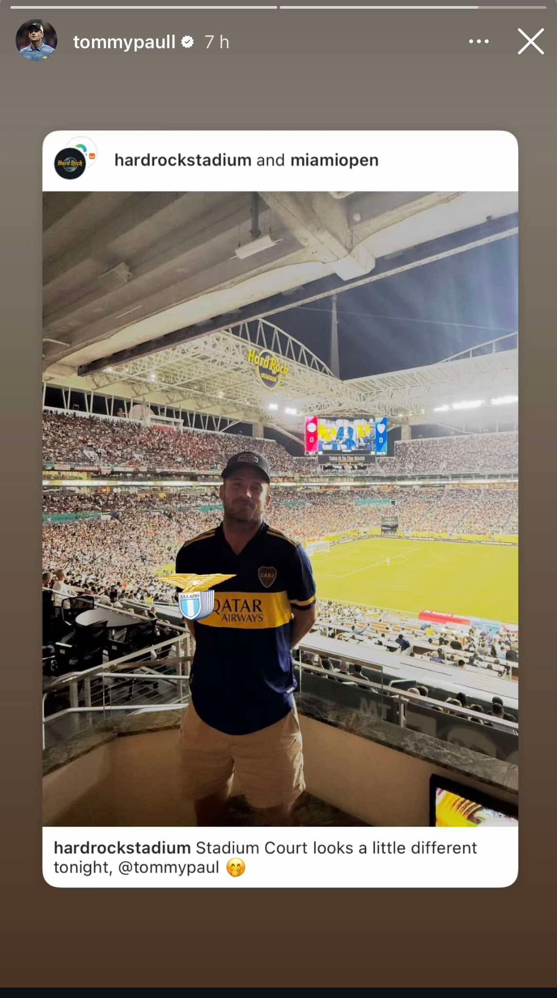 La Lazio prima di tutto. Tommy Paul ormai ha giurato eterno amore ai colori biancocelesti e lo dimostra in ogni occasione. È successo anche durante il Mondiale per Club: era sugli spalti a vedere il Boca Juniors, ma la sua squadra del cuore resta la Lazio. Il segnale è arrivato dalle sue storie Instagram, dove ha ripubblicato lo stemma sopra la sua foto con la maglia della squadra argentina. Di seguito lo scatto.