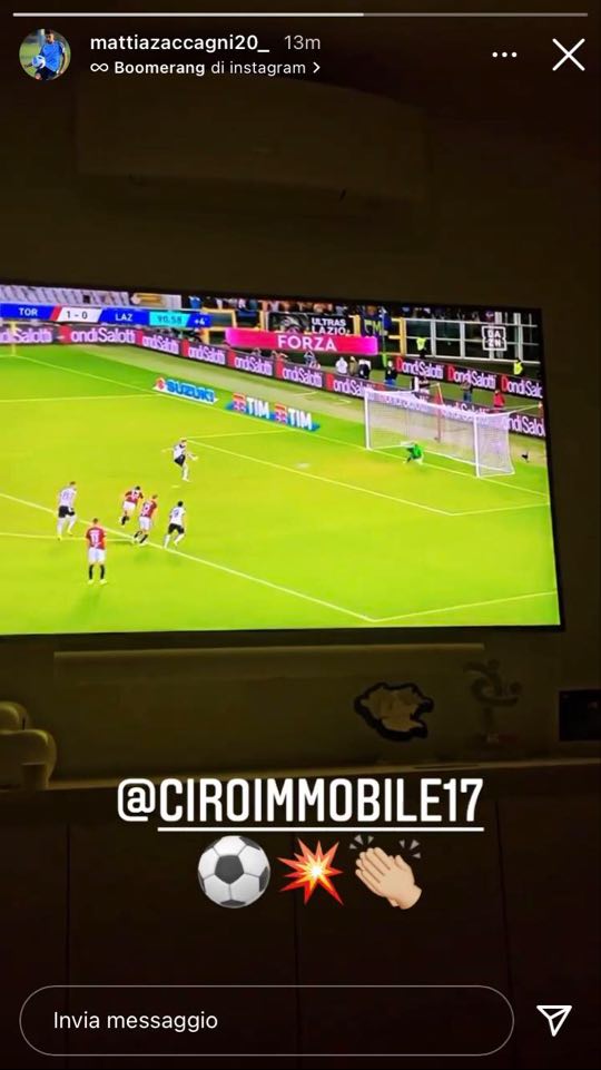 Pareggio amaro allo Stadio Olimpico Grande Torino. La Lazio si divide allo scadere la posta in palio con la squadra di Juric. Pareggio arrivato con Immobile che dopo il rigore assegnato ai biancocelesti per fallo su Muriqi non ha perdonato dagli 11 metri. A esultare sui social è il suo compagno di squadra Mattia Zaccagni, restato fuori per un trauma distrattivo a carico del muscolo ileo-psoas della coscia sinistra. L'esterno ha postato tramite la sua Stories di Instagram un boomerang in cui Ciro firma l'1-1: simbolo di sostegno e supporto per i suoi compagni.