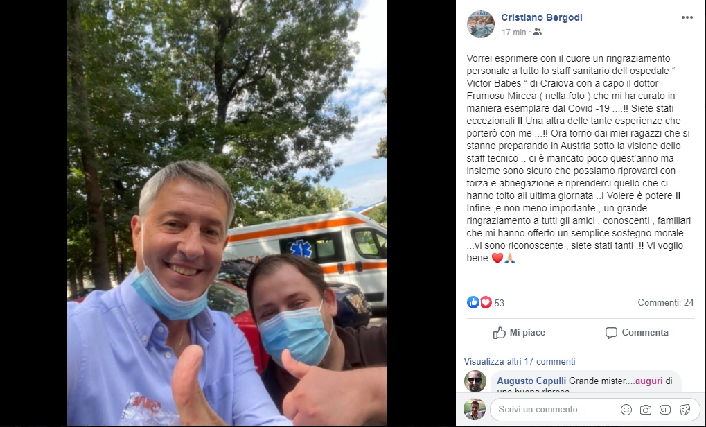 Il tecnico dell'Universitatea Craiova Cristiano Bergodi ha comunicato tramite Facebook una bella notizia. L'ex difensore della Lazio è completamente guarito dal Covid-19 ed è uscito dall'ospedale di Craiova: "Vorrei esprimere con il cuore un ringraziamento personale a tutto lo staff sanitario dell ospedale 'Victor Babes' di Craiova con a capo il dottor Frumosu Mircea che mi ha curato in maniera esemplare dal Covid-19.Siete stati eccezionali! Una altra delle tante esperienze che porterò con me! Ora torno dai miei ragazzi che si stanno preparando in Austria sotto la visione dello staff tecnico. Ci è mancato poco quest’anno ma insieme sono sicuro che possiamo riprovarci con forza e abnegazione e riprenderci quello che ci hanno tolto all'ultima giornata. Volere è potere! Infine, e non meno importante, un grande ringraziamento a tutti gli amici , conoscenti , familiari che mi hanno offerto un semplice sostegno morale. Vi sono riconoscente, siete stati tanti! Vi voglio bene". Ora il mister torna finalmente alla sua vita sul campo.