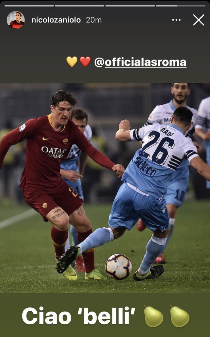Ma guarda chi si rivede. Non ne sentivamo il bisogno, ma si sa la voglia di piacere ai propri tifosi va oltre qualsiasi senso del limite. “Mi prendo una pausa dai social” aveva scritto, salvo rimangiarsi la parola poche ore dopo. Poco importa se da due anni non si parla più di un tuo gol o di un assist o di una giocata, ma solo ed esclusivamente della tua vita privata con una girandola di fidanzate vere o presunte che ti vengono associate. Di chi si parla? Ovviamente di Nicolò Zaniolo che, ancora ai box per il secondo intervento al ginocchio, ha assistito dagli spalti alla vittoria dei suoi compagni nel derby. Immancabile, però, è arrivata la storia Instagram con una foto di tre anni fa e un tunnel a Radu. Il tutto accompagnato dal messaggio “Ciao belli” e due pere. Originalità a parte c’è da dire che il coraggio è veramente apprezzabile. Un anno in cui la Roma ha perso 12 gare e chiuderà settima alle spalle della Lazio non andrebbe festeggiato. Soprattutto visto anche il 6-2 di Manchester e prestazioni abbastanza imbarazzanti. Probabilmente, però, la sua ossessione verso la “Lazio”, dimostrata a più riprese negli ultimi mesi, fa sì che una vittoria sui biancocelesti sia la cosa più importante nella vita (sempre calcisticamente parlando). Viste le critiche ricevute dai sostenitori della Roma per alcuni atteggiamenti, in campo e fuori, quale miglior modo di riconquistarli se non attaccare la Lazio. Troppo facile farlo oggi, però, non credi. Chissà dove eri a gennaio quando nel prepartita arricchivi Instagram con frecciate più o meno dirette con gesti inequivocabili salvo poi sparire dopo il netto 3-0 subito. Facile parlare quando si vince, peraltro, senza meriti personali. Una storia, però, non era sufficiente perché forse poteva passare inosservata. Così nella notte il centrocampista ha avviato una diretta Instagram in cui ha inquadrato il soffitto con in sottofondo l'inno della Roma. Zaniolo non si è mai ripreso facendo vedere solo le mani e mimando 2-0 e a casa, riproponendo un grande classico caro dalle parti di Trigoria.