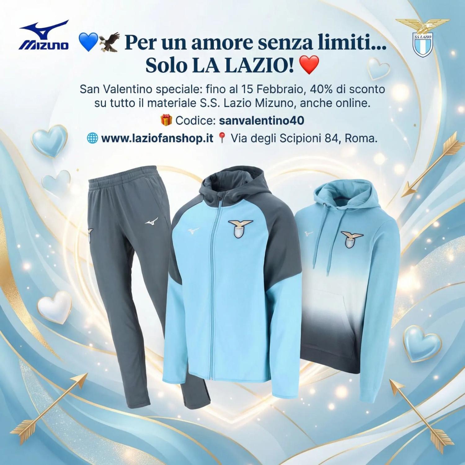 In occasione di San Valentino, fino al 15 Febbraio approfitta del 40% di sconto su tutto il materiale S.S. Lazio Mizuno, disponibile anche online.