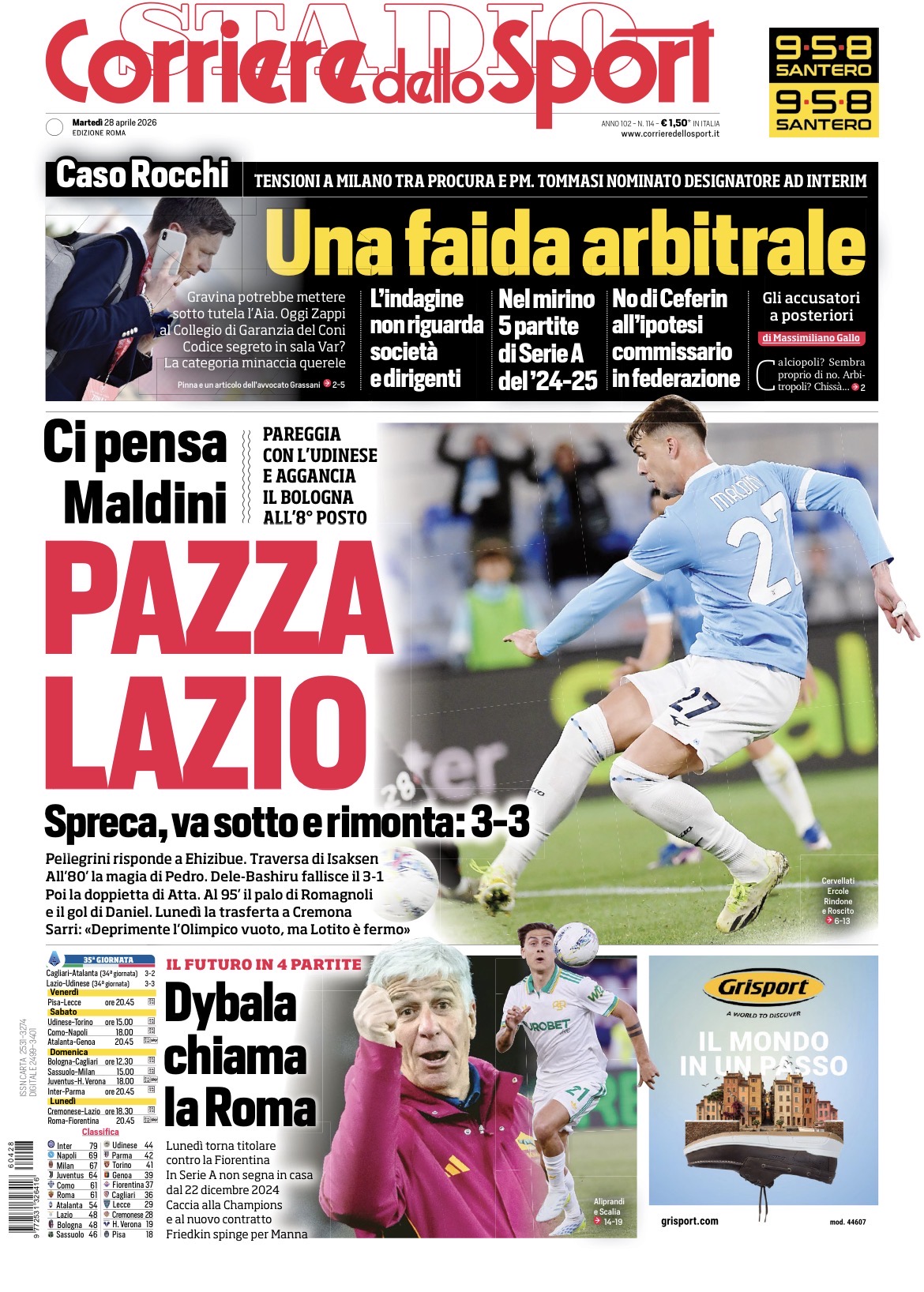 RASSEGNA STAMPA - Il gol all'ultimo per evitare la sconfitta. È una "Pazza Lazio", come scrive Il Corriere dello Sport in prima pagina. La rete di Maldini da subentrato ha acciuffato il pareggio in extremis, recuperando nel punteggio il vantaggio dell'Udinese. "Spreca, va sotto e rimonta: 3-3", si legge ancora. In pochi minuti, infatti, i biancocelesti erano stati recuperati e ribaltati dalla doppietta di Atta, che aveva superato il 2-1 di Pedro. Alla fine ci ha pensato l'ex Atalanta a rimettere a posto le cose e ha salvare la Lazio. Di seguito l'apertura del quotidiano.