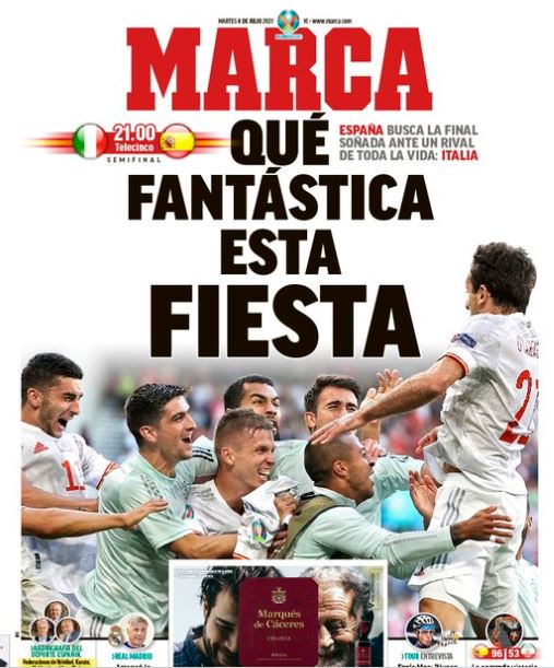 RASSEGNA STAMPA - La scomparsa di Raffaella Carrà ha lasciato a tutti un velo di malinconia. Icona della musica italiana e non solo. Oggi, nel giorno della sfida tra Italia e Spagna il quotidiano sportivo iberico Marca ha dedicato la prima pagina a Raffaella Carrà.“Qué fantástica esta fiesta” è la frase riportata dal quotidiano, dalla nota canzone “Fiesta”. L’artista infatti era conosciuta non solo in Italia ma anche all’estero, in particolare in Spagna e in Argentina dove era una vera star. Una frase simbolica che sia anche di buon auspicio per l’impresa degli azzurri.
