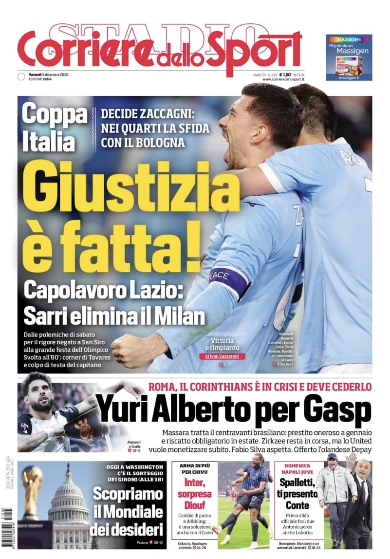 Lazio, contro il Milan "Giustizia è fatta": la prima del Corriere