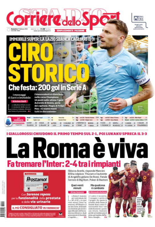 Il capitano biancoceleste, nonostante avesse segnato su rigore nell'ultima gara contro l'Atalanta, non trovava il gol su azione in campionato dalla prima giornata, quando imbeccato da Luis Alberto depositava il pallone alle spalle di Falcone portando i suoi avanti per 0-1 a Lecce, sappiamo poi com'è finita: rimonta salentina e prima beffa della nuova stagione. Questa volta no. Questa volta Ciro ha segnato un gol decisivo e per lui importantissimo. Il bomber della Lazio ha infatti toccato quota 200 in Serie A, raggiungendo un traguardo che inseguiva da mesi e che gli è valso la prima pagina del Corriere dello Sport.