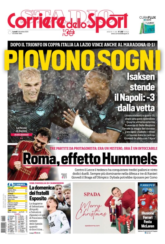 RASSEGNA STAMPA - Al Maradona piove, scende una quantità d'acqua indescrivibile, mentre Napoli e Lazio si danno battaglia nel secondo big match di una giornata di campionato che stravolge ancora la classifica generale. Una sfida combattuta, serrata, che si risolve solo nel finale quando Noslin lancia Isaksen, Olivera non arriva, il danese rientra con il tacco sul marcatore e calcia sotto l'incrocio dei pali battendo Meret. "Piovono sogni" titola il Corriere dello Sport per descrivere il successo della squadra di Baroni, due parole che rendono l'idea perché dopo la vittoria di ieri questa Lazio ha acquisito ancora più consapevolezza, ha capito che il percorso è quello giusto, nonostante qualche inciampo di tanto in tanto e ha svelato che sognare non ha prezzo e che non è mai proibito, soprattutto quando si batte la prima della classe.