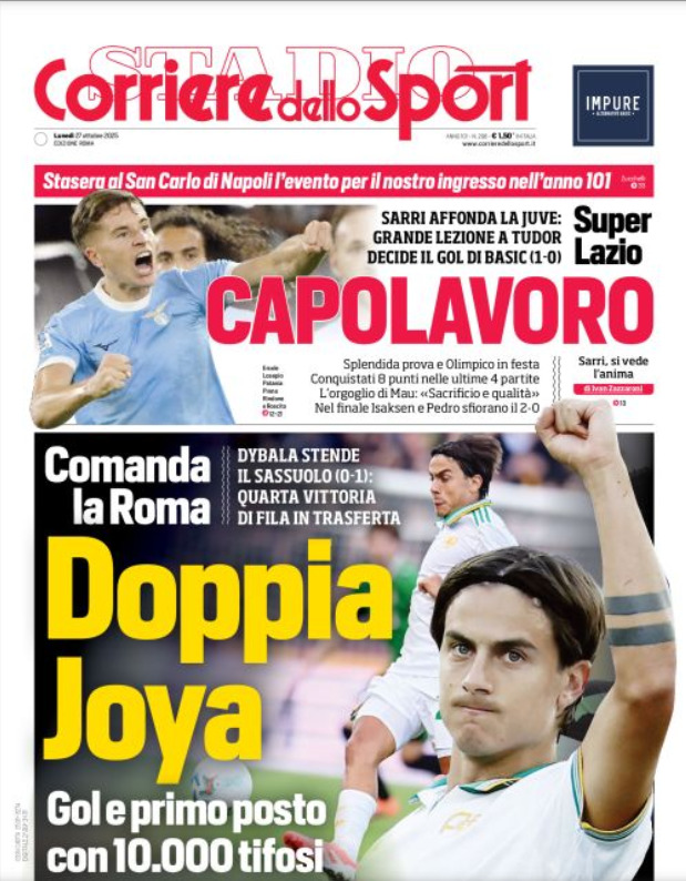 Maurizio Sarri ha fatto un "Capolavoro", come scrive il Corriere dello Sport in prima pagina. La Lazio ha vinto meritatamente e i suoi tifosi possono tornare a sperare in un futuro diverso.
